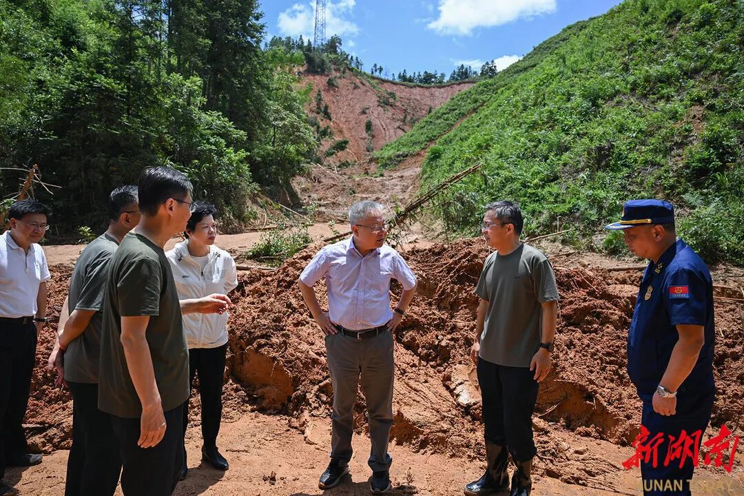 (8月1日,沈曉明在資興市八面山瑤族鄉(xiāng)督導(dǎo)防汛救災(zāi)工作。)